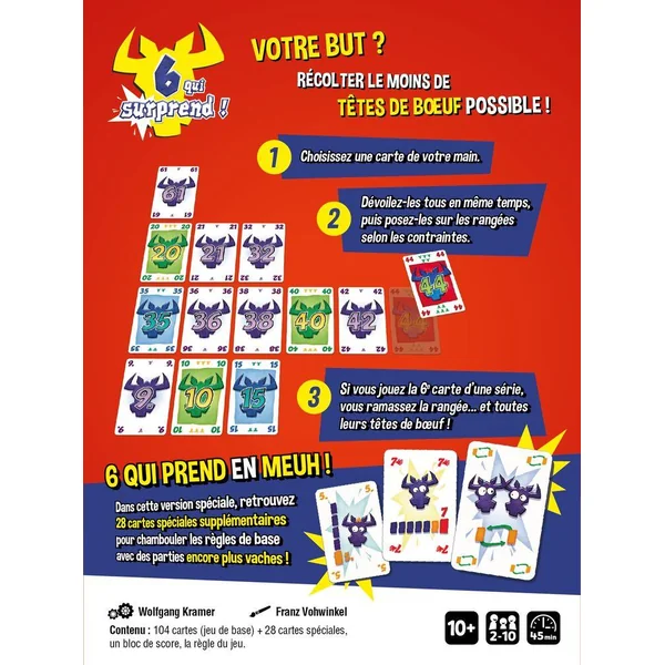 Pour fêter ses 25 ans de succès, 6 qui prend revient dans cette version spéciale comprenant 28 cartes supplémentaires et un bloc de score. Ouvrir une cinquième ligne, augmenter sa capacité à 7 ou encore échanger une carte,… autant d’actions qui pourront peut être vous sauver la mise et vous éviter de prendre ces maudites têtes de boeufs !