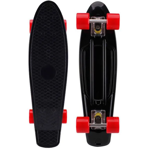 Skateboard vintage. Couleur : noir. Deck ou planche en plastique PP, dimensions 56 x 15 cm (soit 22 x 6 inch). Roues : 60 x 45 mm en PU. Roulements (Bearing) : ABEC-7 acier carbone. Truck : aluminium 7.62 cm (soit 3 inch) avec bague en PU. Poids maximum supporté : 50 kg.
