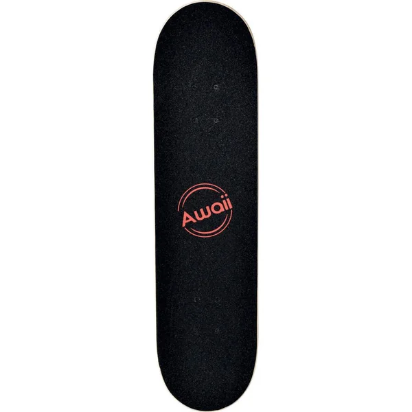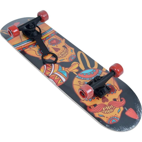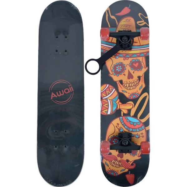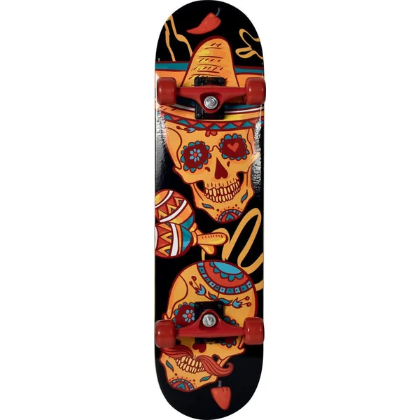 Skateboard Awaii de 31 pouces design Mexican Fair. Planche 8 plis en érable, double kick, grip antidérapant noir imprimé, qualité 80AB, avec une couleur print. Truck aluminium peint finition mate, taille 5 » (12,7cm), kin pin. Cushions PU coulé coloris noir. Roues PVC, 50 x 36 mm. Roulements 608ZZ ABEC 5. Pour utilisateurs à partir de 8 ans. Pour utilisateur d’un poids maximum de 100 kg. Instructions d’assemblage incluses. Poids du skate : 2,2 kg.