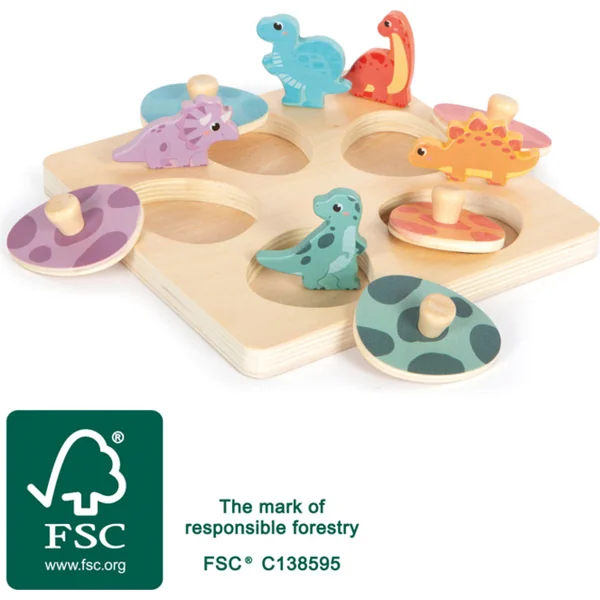 Ce puzzle en bois robuste et coloré sur le thème des dinosaures est fabriqué à partir de bois 100% certifié FSC®.