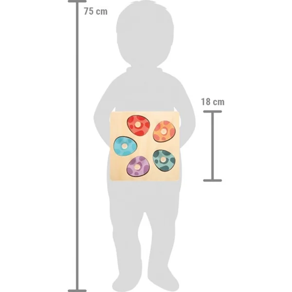 Les enfants peuvent utiliser le puzzle comme un puzzle ou comme un jeu de mémoire. Est-il plus amusant de reconstituer le puzzle par couleurs et motifs et de cacher chaque dinosaure sous l’œuf de la couleur correspondante, ou de mélanger les dinosaures et les œufs et de chercher la paire d’œuf et de dinosaure qui vont ensemble ?