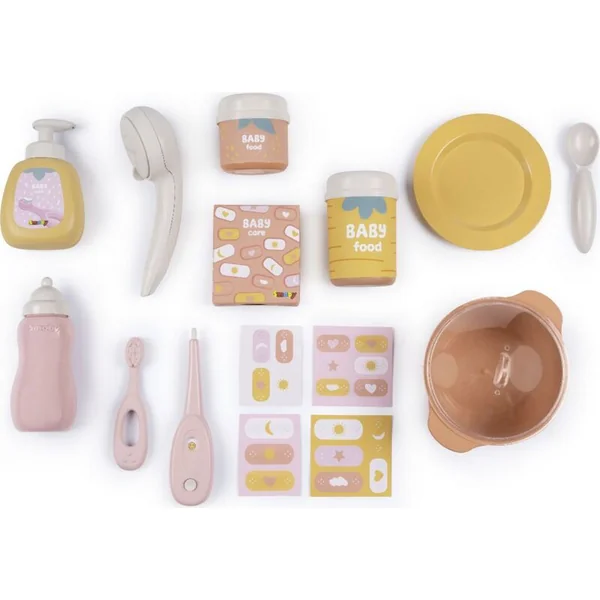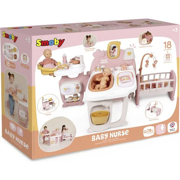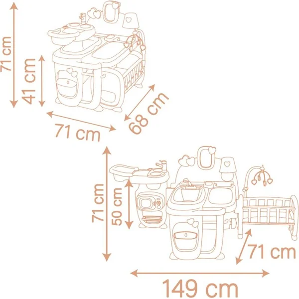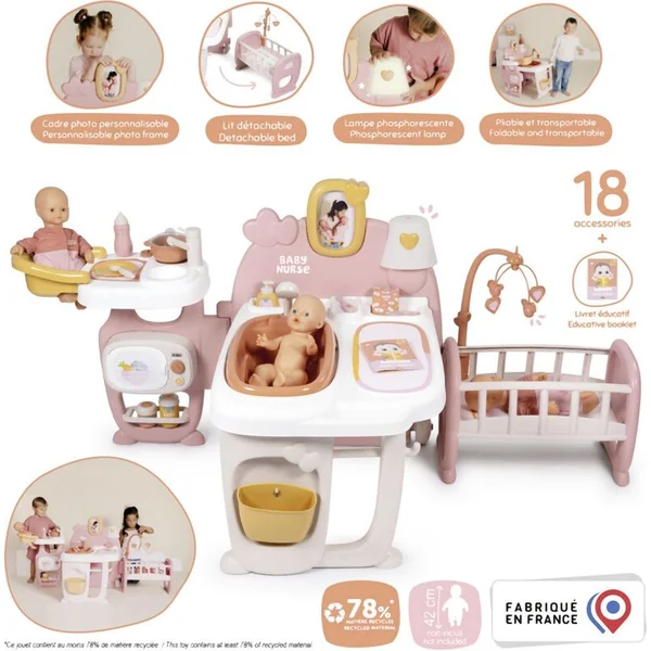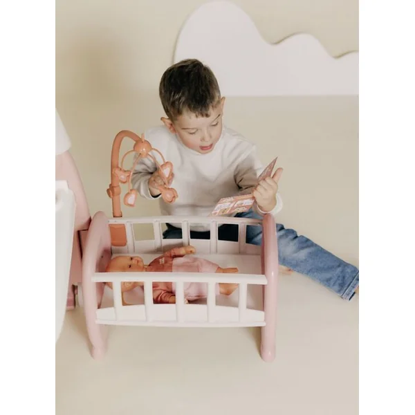 La partie nuit comprend un berceau pour poupées, un mobile rotatif et une lampe phosphorescente. Accessoires : bouteilles, assiettes avec cuillères, casseroles, thermomètres cliniques et divers contenants et emballages vides pour jouer. Convient pour des poupées jusqu’à 42 cm (poupée non incluse).