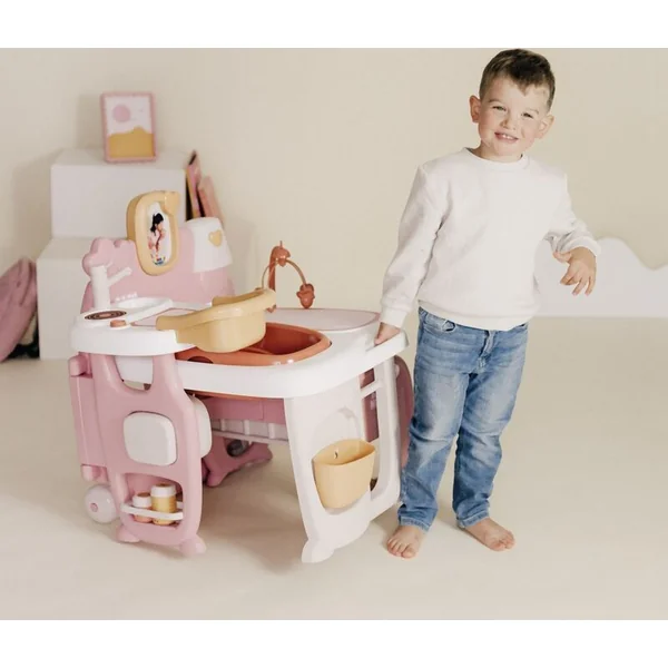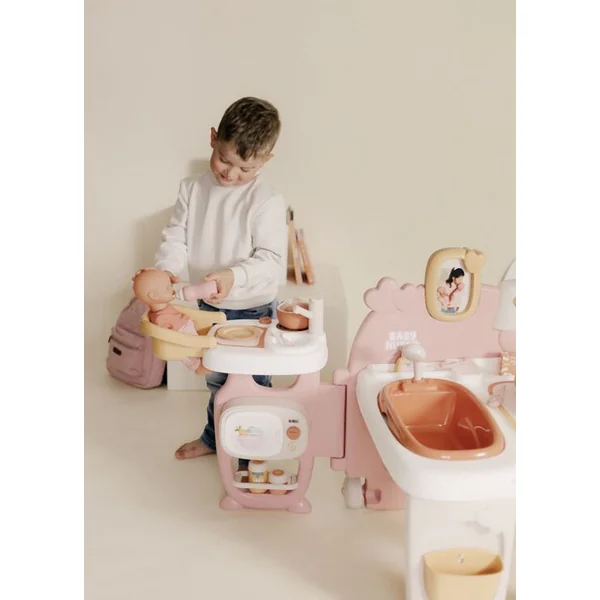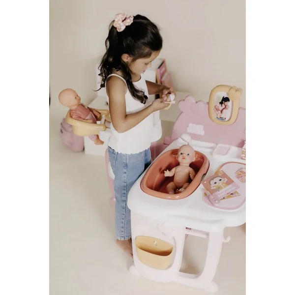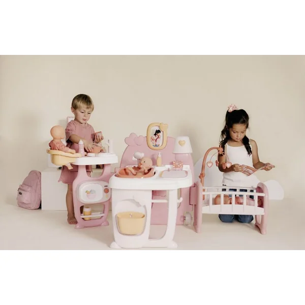 Centre de jeu pour poupées Baby Nurse avec 3 zones de jeu est équipé de roulettes de transport, d’une poignée et est pliable pour un transport facile. Une fois ouvert, il surprend par ses trois coins de jeu spacieux : une cuisine, une salle de bain et une chambre. L’espace de lavage est équipé d’une baignoire amovible, juste à côté se trouve une table à langer qui sert également de vestiaire.