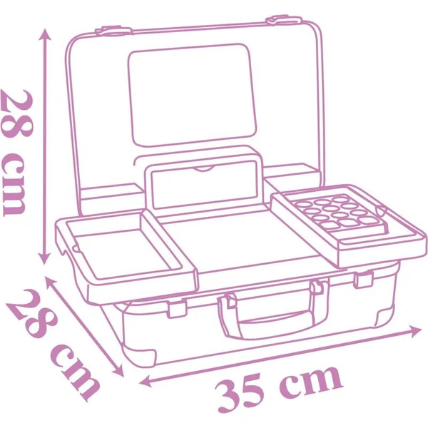 Vous trouverez à l’intérieur de la trousse avec poignée, qui peut être emportée partout, 13 accessoires (faux cosmétiques pour jouer) : 2 vernis à ongles, 2 rouges à lèvres, une palette de fards à paupières, du mascara, un pinceau, un bandeau, un peigne, une bague et divers contenants.