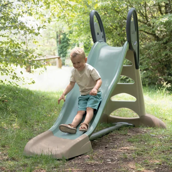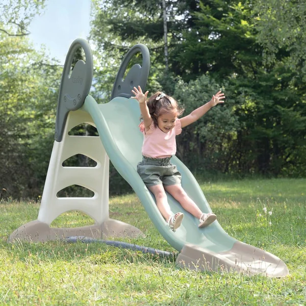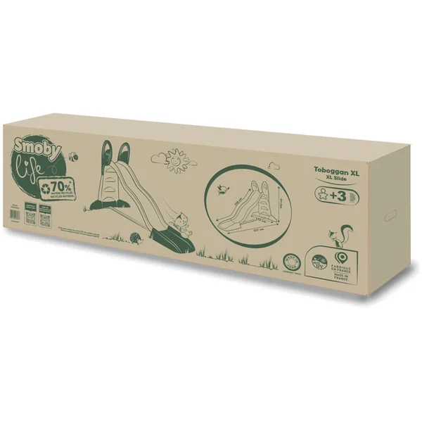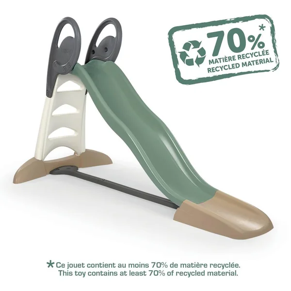 Toboggan très grand modèle en plastique soufflé, qui contient du plastique recyclé. Glisse double vague qui offre une longueur de 2m30. La sécurité est assurée par un large pied qui offre une très bonne stabilité et par une échelle soufflée, équipée de mains courantes ergonomiques. Marches antidérapantes. Possibilité de brancher un tuyau d’arrosage (non fourni) au sommet de la glisse. Les pièces plastiques sont traitées Anti-UV pour une bonne résistance et une meilleure tenue des couleurs dans le temps. Max 50 kg. Ce jouet contient au moins 70% de matière recyclée.