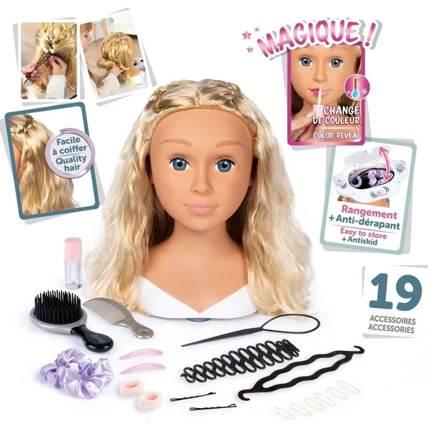 Contient 19 pièces d’accessoires que tu peux ranger dans un compartiment secret à la base de la tête.