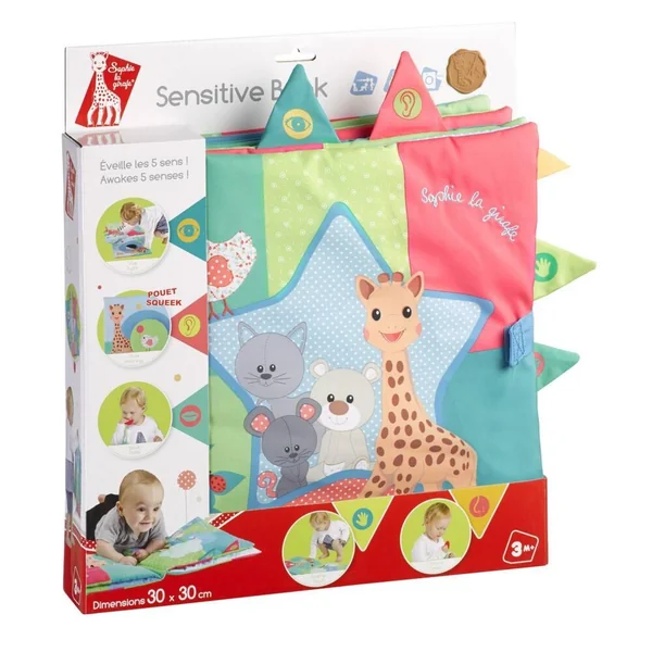Un grand livre tissu à l’effigie de Sophie la girafe et ses amis pour éveiller tous les sens de bébé !Son grand format et ses couleurs vives sont idéals dès le plus jeune âge.De nombreuses activités à découvrir au fil des 6 pages qui mettent tous les sens de bébé en éveil : La vue : un miroir sur la première page pour découvrir son reflet, des contrastes noir/blanc sur la deuxième page pour stimuler sa vue.L’ouïe : un bruiteur caché derrière Kiwi l’oiseau, un effet « papier froissé » sur la dernière page. Le toucher : des textures et des matières variées à parcourir.L’odorat : un anneau avec son parfum doux de vanille intégré. Le goût : un anneau texturé en plastique souple à mordiller pour soulager les gencives.Pratique, il est doté de marque-pages indiquant le sens stimulé sur chacune des pages. Facile à saisir et à transporter grâce a sa poignée.