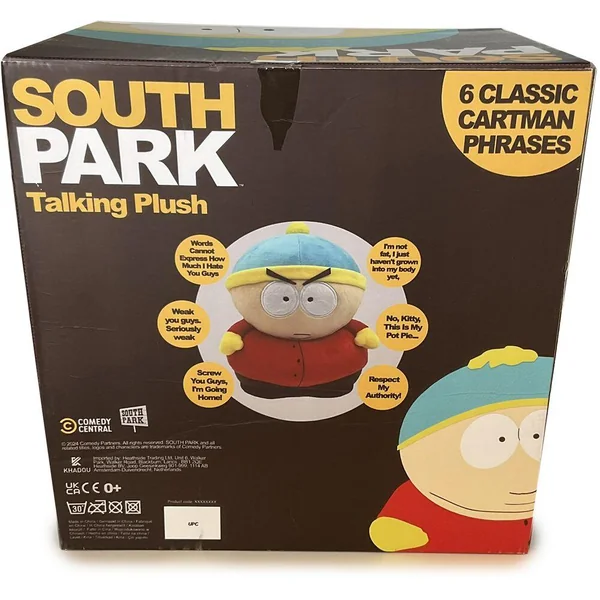 Conçue pour les fans de South Park, cette peluche offre à la fois réconfort et divertissement. Pressez Cartman pour l’entendre prononcer des phrases mémorables comme « Je ne suis pas gros, je n’ai juste pas encore grandi ! » et « Vous êtes faibles, vraiment faibles ». Ses « Les mots ne peuvent exprimer à quel point je vous déteste » et « Respectez mon autorité ! » Ajoutez la touche finale parfaite à cet objet de collection original.