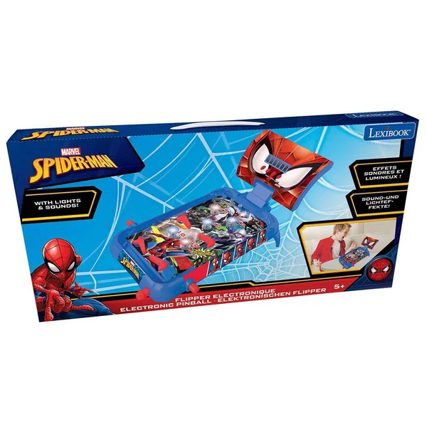 Un flipper de table electronique avec un superbe design spiderman jouez seul ou defiez vos amis score numerique affichage du score le plus eleve sur l ecran lcd musique effets sonores et lumineux comme dans un vrai jeu de flipper 4 flippers leviers et 5 bumpers obstacles 1 balle à l interieur bouton de reinitialisation et possibilite de couper la musique 2 supports pour avoir l angle parfait pour jouer.