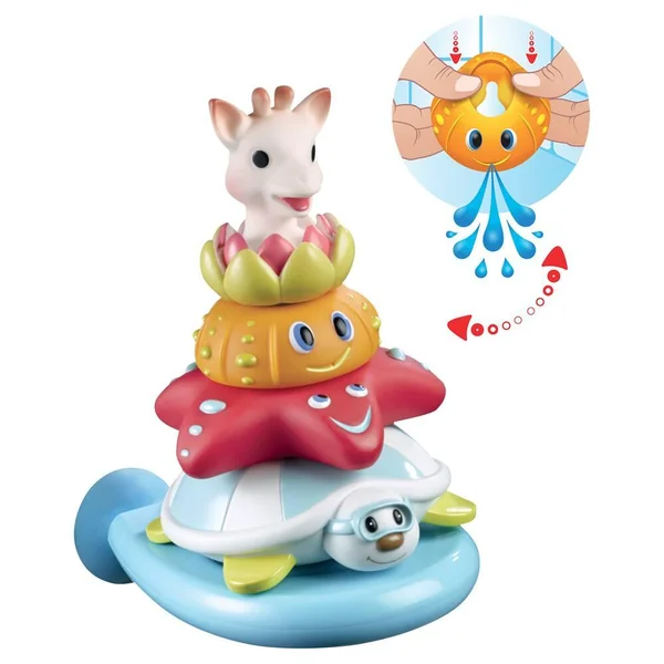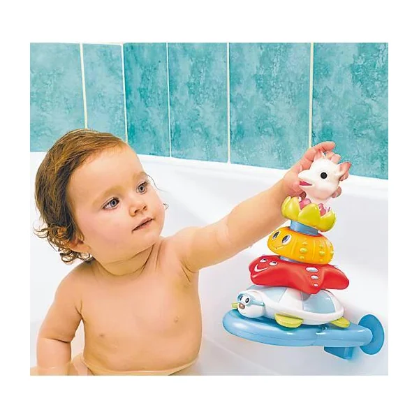 4 anneaux à empiler en forme d’animaux pour développer la dextérité. Le socle de la pyramide se fixe à la baignoire grâce à ses 2 ventouses.