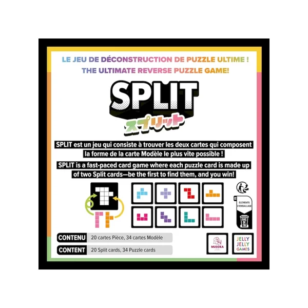 Avec SPLIT, testez votre rapidité et votre sens de l’observation ! Sur la table, 1 carte Modèle et 20 cartes Pièce. Le but du jeu est de reproduire la forme de la carte Modèle en assemblant 2 cartes Pièce. Lorsque la pile de cartes Modèle est épuisée, chaque joueur compte les paires qu’il a reconstituées : celui qui en a le plus remporte la partie. Prêt ? Partez !