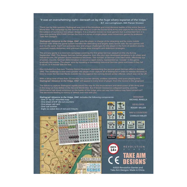 Stalingrad Advance to the Volga, 1942 place le joueur aux commandes de l’attaque allemande, beaucoup plus mobile, tandis que le système de jeu s’occupe de la défense soviétique, largement statique. Il n’y a pas deux parties identiques. Chaque tour représente un défi nouveau et unique pour le joueur sous la forme d’événements aléatoires, de livraisons de ravitaillement incertaines et de stratégies défensives et de force de zone soviétique inconnues.