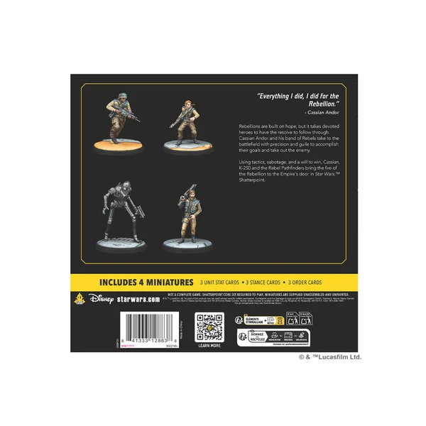Le pack d’escouade All The Way amène les personnages rebelles de Rogue One : A Star Wars Story™ dans Star Wars™ : Shatterpoint. L’incroyable Cassian Andor est rejoint par K2S0 et les éclaireurs rebelles dans ce pack d’escouade passionnant et thématique.