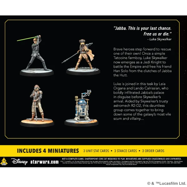 Avec la Force comme alliée, le chevalier Jedi Luke Skywalker dirige cette escouade de Rebelles en tant qu’unité principale. Il est rejoint par Leia Organa sous son déguisement de Boussh en tant qu’unité secondaire, tandis que Lando Calrissian et R2-D2 joignent leurs forces en tant qu’unité de soutien. Basé sur la mission audacieuse de ces personnages pour sauver Han Solo dans Le Retour du Jedi, ils forment une escouade complète de l’époque de la Guerre Civile Galactique qui fonctionne particulièrement bien avec les personnages de l’Alliance Rebelle.