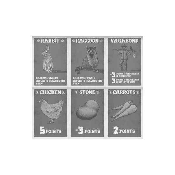 À chaque tour, piochez une carte et choisissez de l’ajouter à votre ragoût ou de nourrir l’un des nuisibles pour protéger votre marmite.Ne tardez pas trop, sinon vos collègues fermiers risquent de manger votre ragoût à votre place !