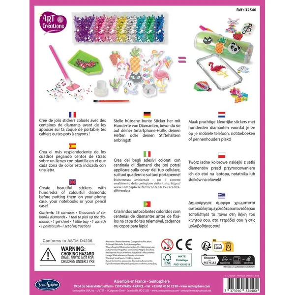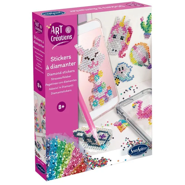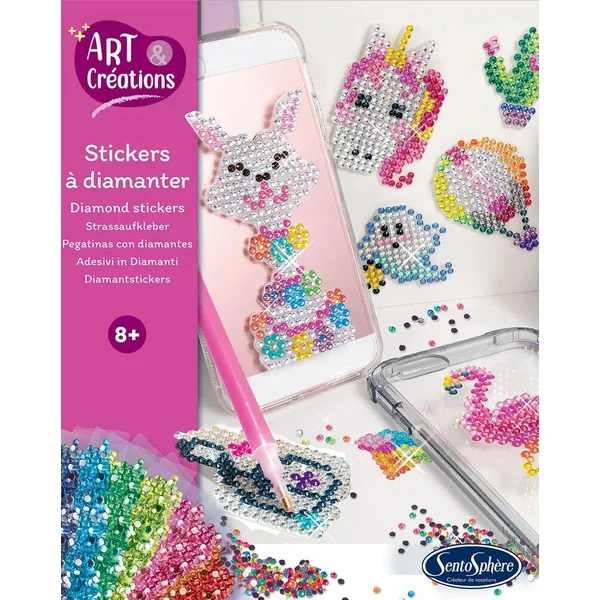 Créer plus de 15 stickers diamantés en recouvrant de jolis motifs de milliers de strass multicolores. Une fois terminés, ces autocollants scintillants viendront décorer des coques de portables, des cahiers, des verres ou même des trousses !
