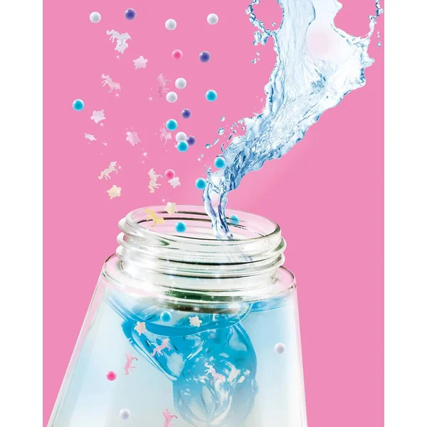 Fabrique ta propre mini lava lampe grâce aux accessoires inclus. Verse les décorations, ajoute de l’eau. Customise-la avec les stickers.