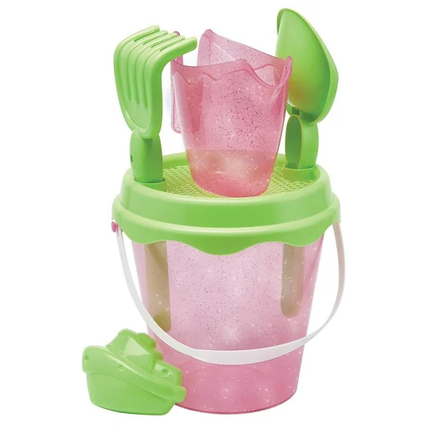 Un seau de plage de 17 cm de diamètre pailleté garni d’un tamis, d’une pelle, d’un râteau, d’un arrosoir et d’un moule à sable. 2 couleurs au choix. Conseillé dès 18 mois.