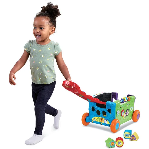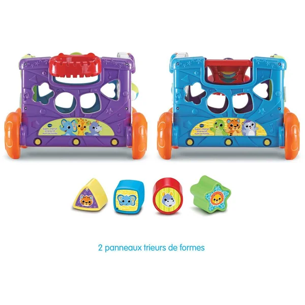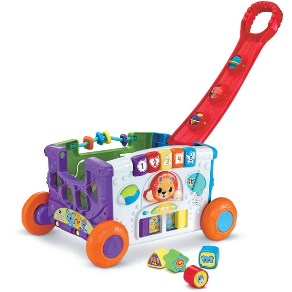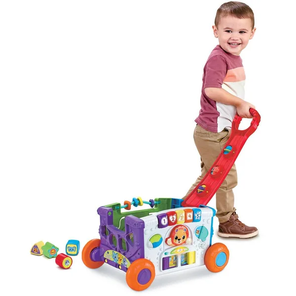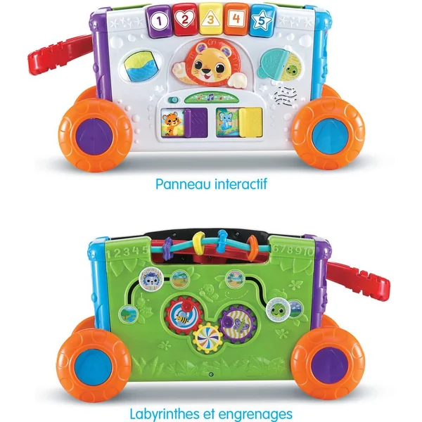 Grâce à son chariot, l’enfant découvre les chiffres, les couleurs et les animaux ! Il peut se servir du bac pour y ranger tous ses jouets et s’amuser à les emporter partout avec lui.
