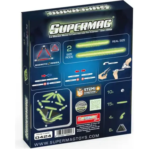 La série Glow (Brille dans le noir) reprend tous les principes éducatifs et de construction du jeu de construction magnétique Supermag et y ajoute un élément fluorescent spécial.