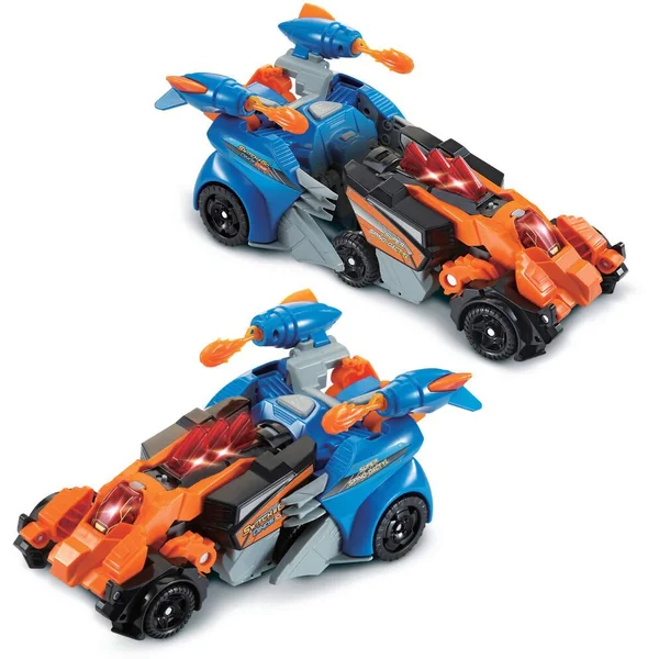 Un spinosaure et un ptérodactyle à transformer et à assembler pour créer une voiture de course avec projection de boule de feu ! 2 en 1 pour encore plus de jeu : Un spinosaure avec effets sonores et lumineux qui se transforme automatiquement de véhicule en dino lorsqu’on appuie sur sa crête. Un ptérodactyle avec lanceur de boules de feu à transformer manuellement. Une fois assemblés, les deux dinos deviennent une super voiture de course avec effets et lumineux et projection de boules de feu. Deux modes de jeu : mode Véhicule et mode Dino. Chaque mode se déclenche automatiquement lorsque la transformation est effectuée. Le bouton situé sur le ptérodactyle en mode voiture permet aussi de propulser et de transformer automatiquement le spinosaure en dino. Avec plus de 30 sons réalistes et phrases liés à l’univers des dinos et des effets lumineux. Arrêt automatique. Fonctionne avec 1 pile LR03 fournie. Pile de démonstration fournie