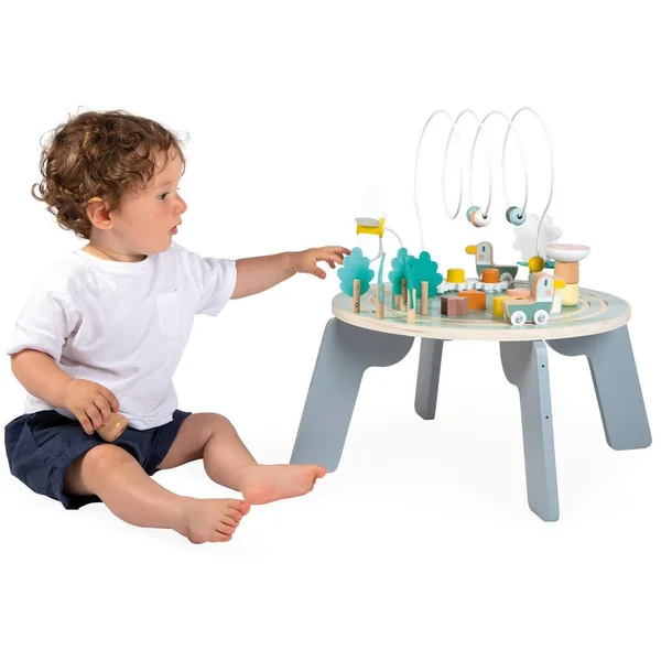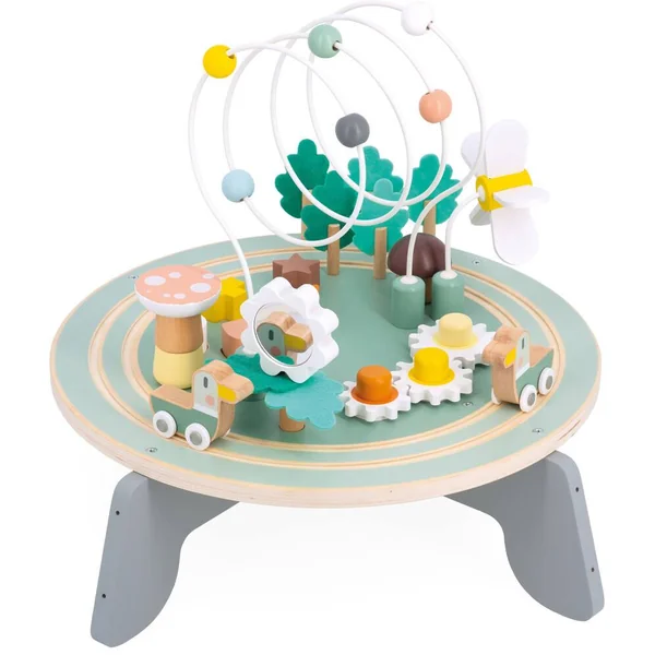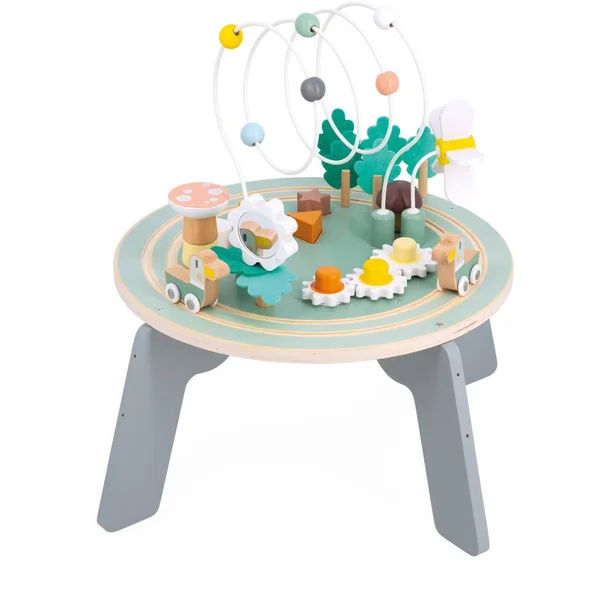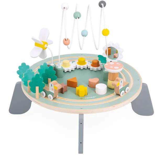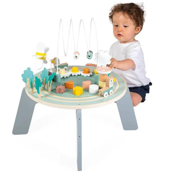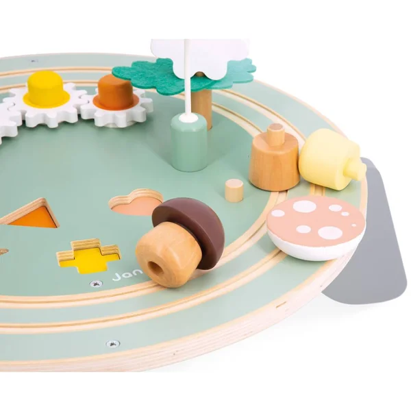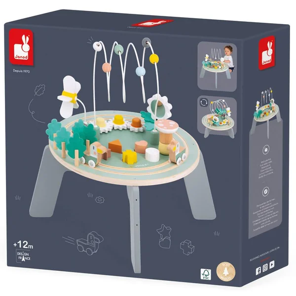 Venez explorer ce jardin aux activités super chouettes ! Sur cette table d’activité se trouve : un champignon géant à empiler, 5 pièces à encastrer, une forêt de feuilles en feutrine, une marguerite géante à empiler avec un miroir dessus pour s’admirer, 1 grand boulier, 3 engrenages en forme de fleurs, un moulin qui tourne lorsque le canard passe dessous et un champignon qui fait crac-crac. En tout, c’est plus de 8 activités qui garantiront des heures de jeu et d’amusement pour les plus petits ! Cette table évolue avec l’enfant, les pieds peuvent être mis en position haute (hauteur du plateau : 22 cm) ou basse (hauteur du plateau : 13 cm), pratique ! Jouet idéal pour que bébé développe sa motricité fine. Jouet d’éveil en bois FSCTM. Pour les enfants à partir de 12 mois.