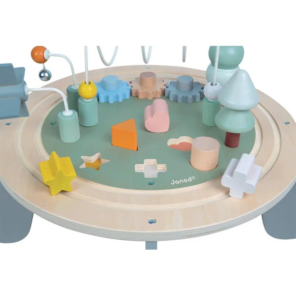 Cette table multi-activités en bois est parfaitement adaptée aux tout-petits ! Bébé va pouvoir toucher à tout et apprendre en s’amusant avec tous ces petits jeux : un rail de train circulaire avec 2 véhicules, 2 arbres à empiler, 3 loopings avec des billes, un moulin et une clochette, 3 engrenages à faire tourner et 5 formes à encastrer. Cette table multi-activités est équipée de pieds anti-dérapants pour plus de stabilité. La hauteur de la table est de (14 ou 22.5 cm). Ce jouet en bois fait partie de la collection Sweet Cocoon, une gamme aux couleurs délicates, inspirée des tendances actuelles pour accompagner les premiers apprentissages de votre enfant tout en douceur !