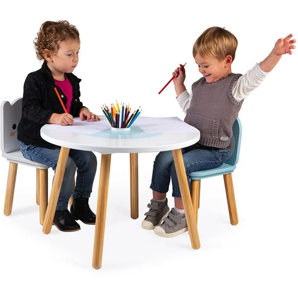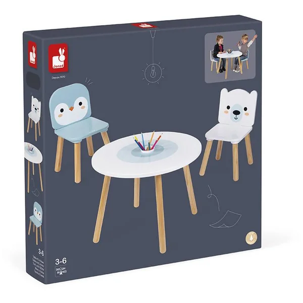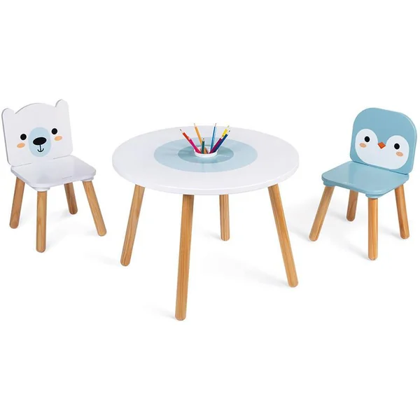 Pour enfants de 3 à 6 ans. Mobilier en bois Table et chaises de qualité, adaptées à la taille des enfants, dès 3 ans pour dessiner et jouer à volonté. Couleurs douces et design original sur le thème de la banquise. Pot à crayon amovible fourni. Crayons de couleurs non inclus.