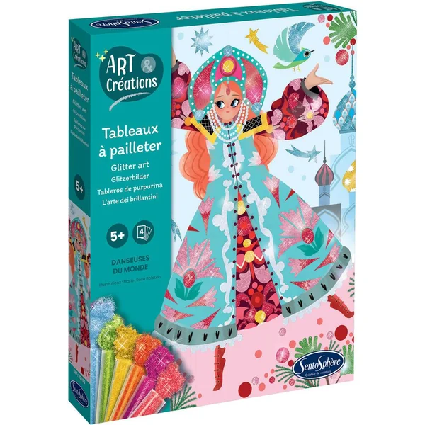 Ce coffret contient 4 tableaux encollés et prédécoupés que l’on va pouvoir embellir grâce à des paillettes multicolores. Un résultat garanti pour encourager l’enfant dans la création.