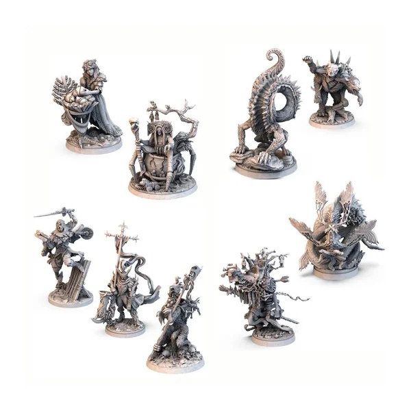 Tainted Grail – Kings of Ruin : Wyrd Encounters contient des figurines de toutes les créatures Gardiennes que vous pouvez rencontrer au cours de vos aventures dans l’ouest d’Avalon. Vous pouvez utiliser ces figurines pour marquer la position des Gardiens sur les lieux au lieu de placer leurs cartes Rencontre sur la carte.