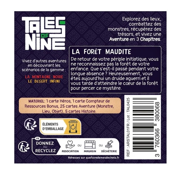 Chaque boîte de Tales of Nine contient 3 chapitres d’une histoire à découvrir sous forme de cartes. Huit d’entre elles sont placées autour de la carte Héros, formant la région ou le donjon à explorer. Déplacez votre héros en utilisant son mouvement de base ou une carte précédemment acquise. Affrontez les monstres en dépensant les ressources nécessaires et venez à bout de chaque chapitre en accumulant des trésors et en visitant les différents lieux.