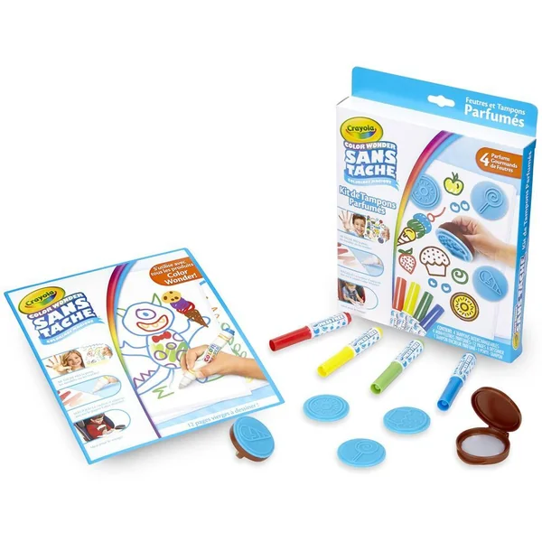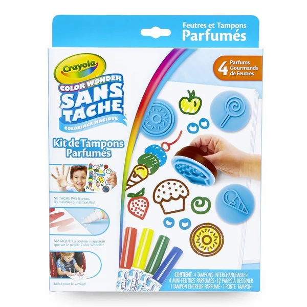 MAGIQUE ! Avec Color Wonder, l’encre n’apparaît que sur le papier Color Wonder ! Découvre ces tampons aux couleurs parfumés et aux formes amusantes pour réaliser des créations gourmandes qui n’apparaissent que sur le papier Color Wonder ! Le set comprend 5 feutres parfumés (banane, orange, citron, cocktail de fruits, myrtille), 5 tampons, 12 pages à dessiner, 1 tampon encreur parfumé au chocolat.