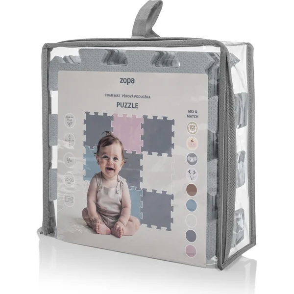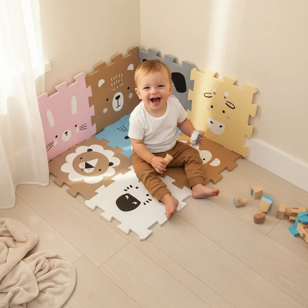 Les dalles individuelles de 30 × 30 cm (9 pièces) s’emboîtent parfaitement. Le tapis est adapté aux enfants dès la naissance, fabriqué à partir de matériaux non toxiques et agréables.