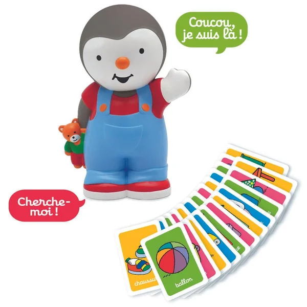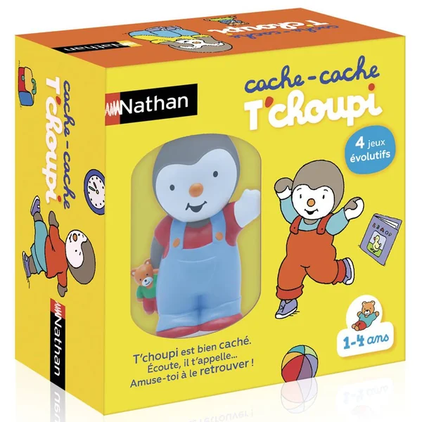 T’choupi, l’ami des petits, accompagne l’enfant de 12 mois à 4 ans dans ses découvertes. Papa et maman ont caché T’choupi dans la maison ! retrouve-le grâce aux indices sur les cartes ou au son de sa voix… 4 modes de jeux progressifs sous forme de parties courtes sont proposés en fonction de l’âge et du développement de l’enfant, ainsi qu’une variante pour jouer à plusieurs : coucou-caché, caché-trouvé, cache-cache indice et la chasse au trésor. Hauteur : 11 cm.