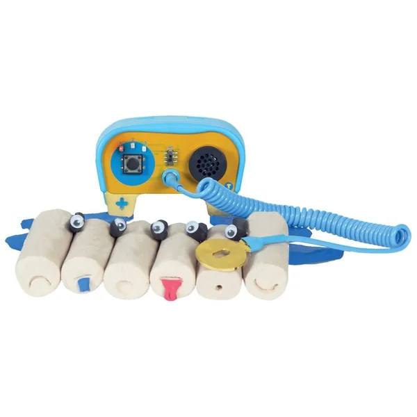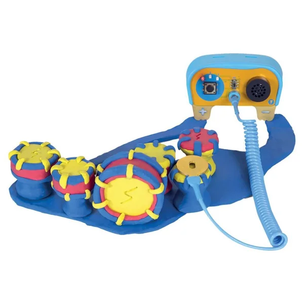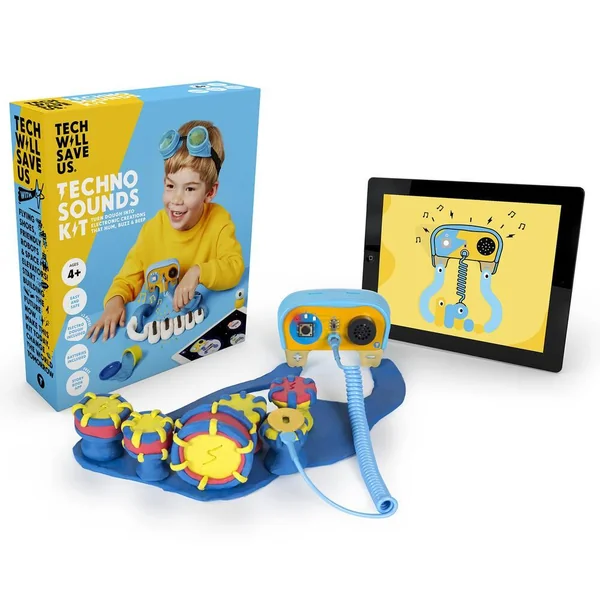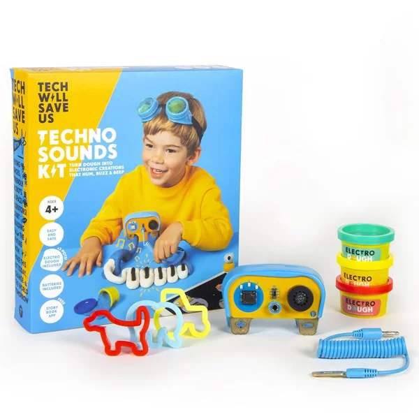 Gamme Tech Will Save Us. Transforme ta pâte à modeler en créations électroniques qui bourdonnent, bipent et sonnent. Et comprends, en jouant, le fonctionnement du circuit électrique. Ce kit permet une première approche des circuits électriques et de la formation de son de façon ludique. À toi les circuits en série et parallèles, la compréhension du fonctionnement d’un interrupteur, la découverte de la conductivité… Ce kit inclut trois couleurs de pâtes à modeler et des moules à pâtes. Instructions basiques dans le kit, tous les projets créatifs et pédagogiques sont à retrouver sur l’application Dough Universe disponible sur l’AppStore et Google Play. 2 piles LR6 fournies. Contenu : régulateur de son intelligent, 3 pots de pâte électro, conducteur et 3 emporte-pièces. Fonctionne avec la plupart des marques de pâte à modeler. Accès gratuit à l’appli d’histoires Dough Universe. Les dimensions indiquées sont les dimensions d’un circuit en pâte à modeler utilisant le kit.