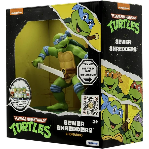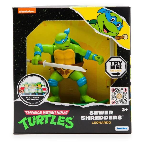 Turtles sont des tortues mesurant environ 13 cm sur des patins, prêtes au combat. Ils présentent le design signature des populaires Tortues Ninja tenant leur arme emblématique. Tirez la tortue Ninja vers l’arrière, relâchez-la et regardez-la rouler ! Appuyez sur le bouton de la coque pour démarrer le mode combat !