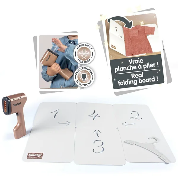 Le set Défroisse ET Plie comprend un défroisseur Tefal avec fonction vapeur, un cintre et une planche à plier ingénieuse. Parfait pour apprendre à plier les vêtements de manière ludique, ce kit transforme une simple tâche du quotidien en une activité amusante et éducative !.