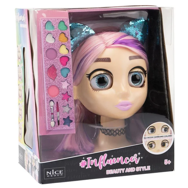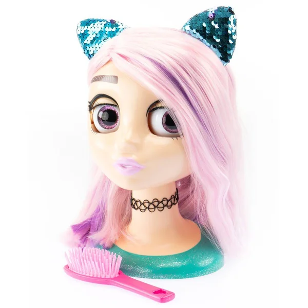 Tête de poupée aux cheveux longs de 30 cm équipée d’un mécanisme à levier qui permet de choisir entre 4 couleurs d’yeux ainsi que d’une base avec ventouses pour la verrouiller sur des surfaces lisses.