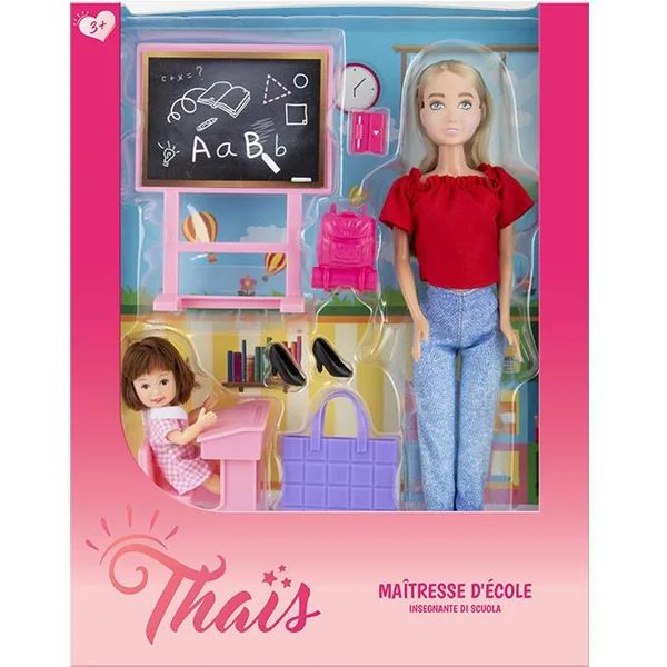 Poupée mannequin de 29 cm avec 1 enfant de 10 cm et des accessoires. Contenu : 1 poupée mannequin avec tenue et chaussures, 1 poupée enfant avec tenue et chaussures, 1 tableau noir, 1 bureau, 1 sacoche, 1 cartable et 1 carnet. Instructions imprimées sur la boîte. Mode, sport ou voyage… Thaïs est la poupée tendance qui se révèle à travers ses passions.