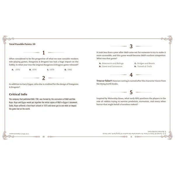 Mettez vos connaissances à l’épreuve avec The Düngeonmeister Book of RPG Trivia. Découvrez des questions captivantes et des anecdotes fascinantes sur l’histoire des jeux de rôles, vos genres préférés, et leurs liens avec les médias et les jeux vidéo.