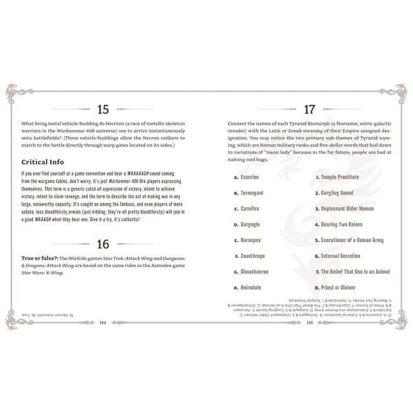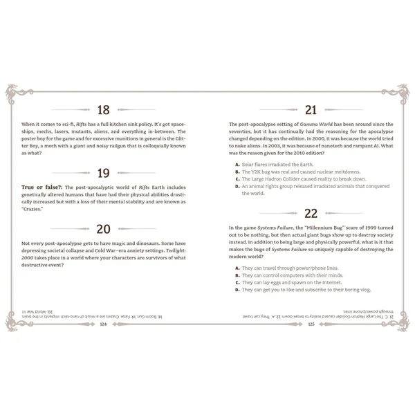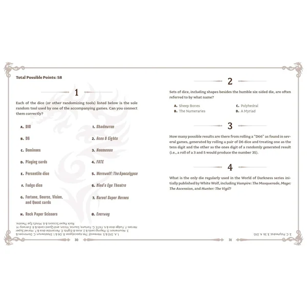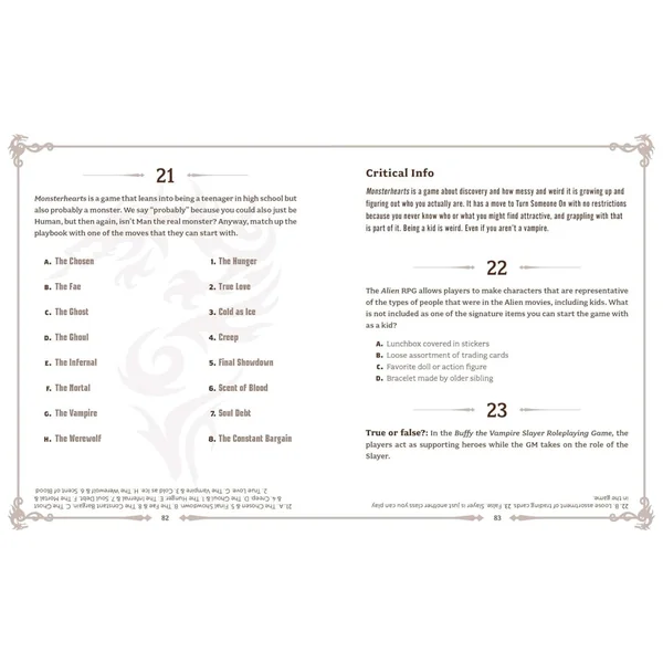 Profitez d’une toute nouvelle manière de jouer lors de vos soirées jeux ou entre deux campagnes grâce à cette collection de 400 questions sur vos jeux de rôles préférés, parfaite pour tester vos connaissances en solo ou défier vos amis entre deux parties.