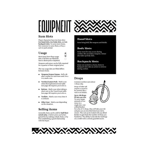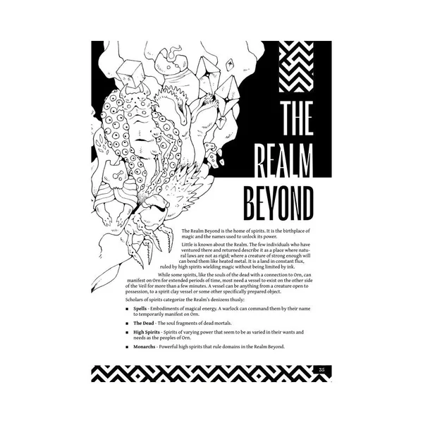 Ce zine est un recueil de règles de base et de procédures, ainsi qu’une introduction au cadre d’Orn, un lieu abandonné depuis longtemps par une race extraterrestre aujourd’hui connue sous le nom d’Anciens. L’encre magique laissée dans les épaves de ces anciens extraterrestres sert aujourd’hui de monnaie d’échange et les sorciers l’inhalent pour lancer leurs sorts. Des aventuriers, appelés chercheurs d’encre, s’aventurent dans le monde en décomposition au-delà des villes gouvernées par des maisons de marchands intrigants, à la recherche d’artefacts et d’encre des Anciens.