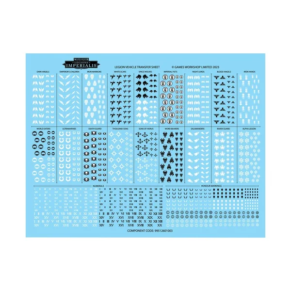 Ce kit s’accompagne de 4x Planches de Décalcos des Véhicules des Légions, comprenant chacune 1130x décalcos de grande qualité, et de 1x Planche de Décalcos des Appareils Volants des Legiones Astartes, comprenant 748 décalcos de grande qualité, afin de décorer vos figurines. Il s’y trouve des icônes pour chacune des 18 Légions de l’Hérésie d’Horus, ainsi que des chiffres et des symboles honorifiques. Ce kit est composé de 769 éléments en plastique, de 24x Socles Ronds Legions Imperialis de 32mm, de 2x Socles Volants Ronds Legions Imperialis de 40mm, de 4x Tiges à Rotule, de 4x Planches de Décalcos des Véhicules des Legiones Astartes et de 1x Planche de Décalcos des Appareils Volants des Legiones Astartes. Ces figurines sont fournies non peintes et nécessitent assemblage – nous recommandons d’employer la Colle Plastique Citadel et la peinture Citadel Colour. Cette boîte n’est disponible que dans la limite des stocks.