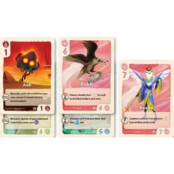 Avec l’extension The Vale of Eternity – Artifacts, explorez la puissance des objets magiques ! Chaque tour, les joueurs choisissent un artefact permettant ainsi de gagner de nouveaux pouvoir tel que l’Accueil ou l’Abris, d’augmenter la puissance de vos créatures ou votre arène. La piste de score s’étend maintenant jusqu’à 80 points. Vous allez découvrir 24 nouvelles créatures légendaires pour encore plus de combos.