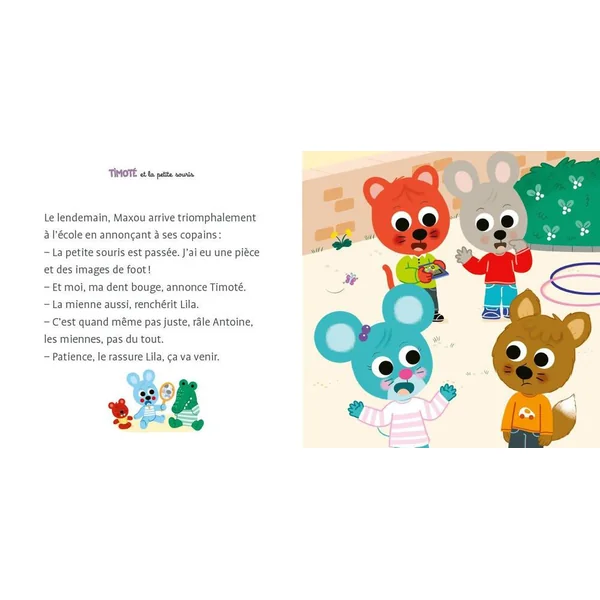 Timoté est un petit lapin qui, au fil des albums, partage sa vie avec ses copains et sa famille. aujourd’hui,Timoté est très intrigué car Maxou a perdu une dent. Cela l’inquiète beaucoup car lui aussi a une dent qui bouge. Heureusement, la maîtresse va tout expliquer et papa et maman vont le rassurer La petite souris des dents viendra bientôt lui faire oublier toutes ses craintes lorsqu’au réveil, il découvre une pièce et des images de foot ! Chaque enfant et chaque parent se reconnaîtront dans cette histoire qui offre en miroir les émotions de leur vie.