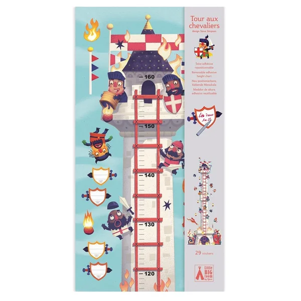 Une grande toise murale, idéale pour mesurer les petits chevaliers au fil du temps (jusqu’à 1,60 m) ! Une grande tour à assembler et de stickers à coller librement pour une création unique.