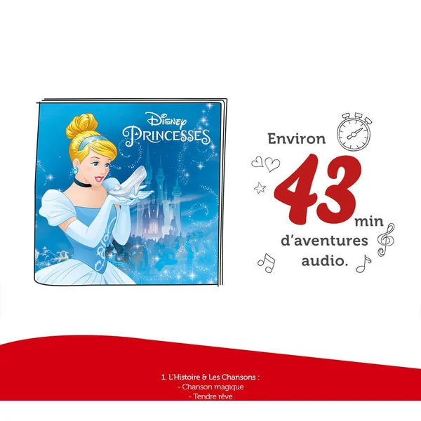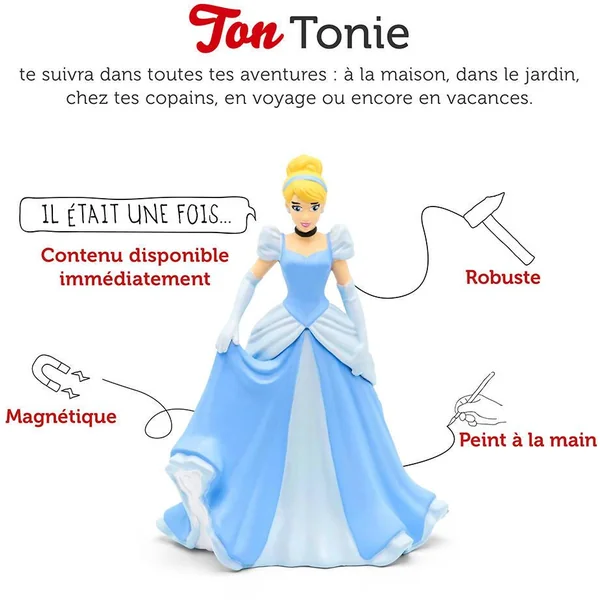 Avec votre figurine TONIES® Cendrillon et votre TONIES®box (vendue séparément), embarquez pour une aventure audio unique (env. 43 minutes), inspirée de l’histoire originale du célèbre film de Disney et incluant deux chansons emblématiques : Chanson magique ET Tendre rêve. Et une fois l’aventure audio terminée, prolongez l’expérience de jeu dans le monde réel avec cette attachante figurine peinte à la main.