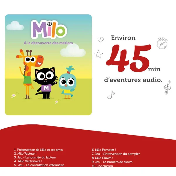 Vétérinaire, pompier, facteur, clown… Dans le monde de Milo, rien n’est impossible ! Et pour prolonger l’immersion, un jeu sonore complète chaque épisode.