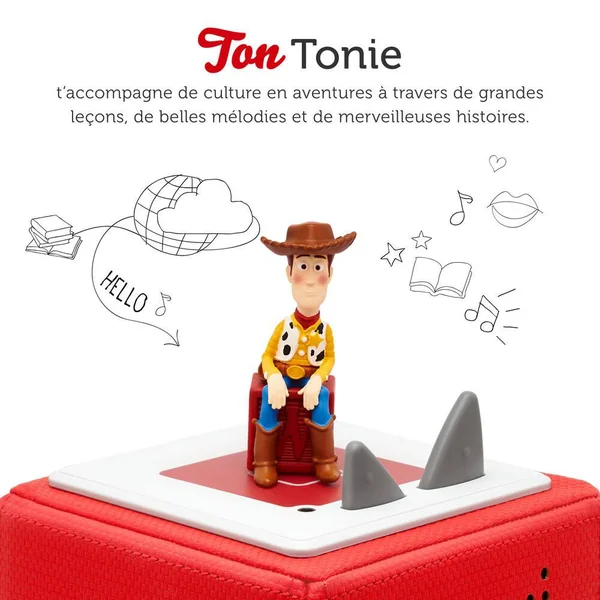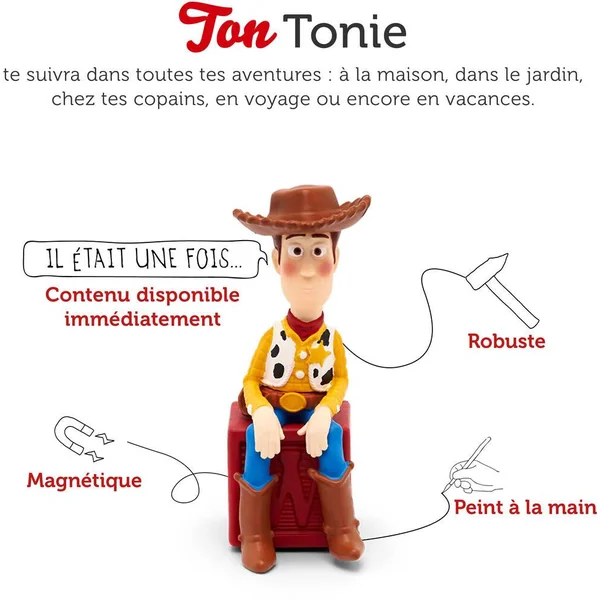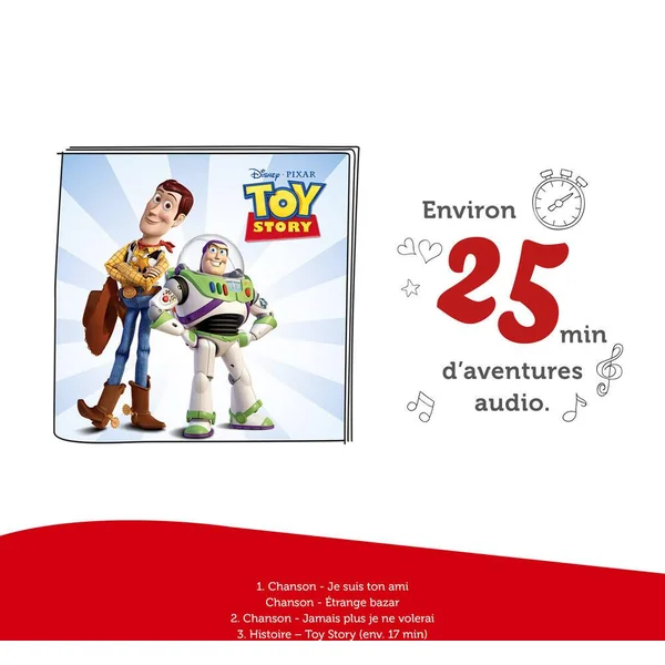 Avec votre figurine TONIES® Toy Story à l’effigie de Woody et votre TONIES®box (vendue séparément), embarquez pour une aventure audio unique (env. 25 minutes), inspirée de l’histoire originale du célèbre film de Disney et incluant les chansons les plus emblématiques (Je suis ton ami, Étrange bazar ET Jamais plus je ne volerai). Et une fois l’aventure terminée, prolongez l’expérience de jeu dans le monde réel avec cette attachante figurine peinte à la main.