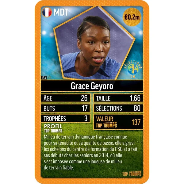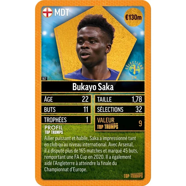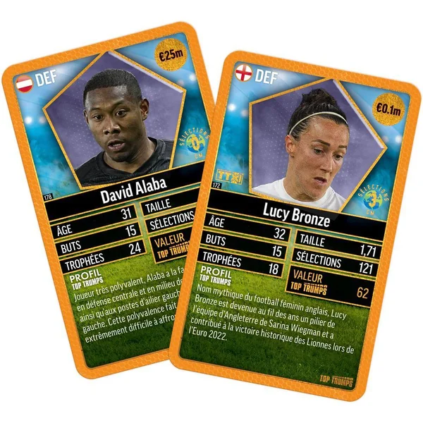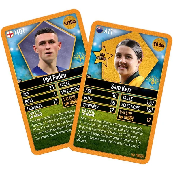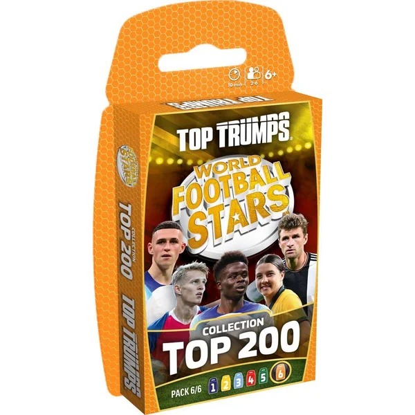 Entrez sur le terrain de jeu avec Top Trumps World Football Stars Top 200 ! Collectionnez les meilleurs joueurs de foot des plus grandes ligues mondiales : Angleterre, France, Italie, États-Unis, Allemagne, Espagne, et Moyen-Orient. Hommes et femmes, 34 des meilleurs joueurs et joueuses sont réunis dans ce sixième pack. Collectionnez les 6 pack World Football Stars Top 200 pour obtenir la collection complète. Qui a le plus de trophées entre Sam Kerr et Thomas Müller ? Qui vaut le plus : Phil Foden ou Bukayo Saka ? Comparez les statistiques, apprenez des faits surprenants et défiez vos amis pour découvrir qui possède la meilleure carte.